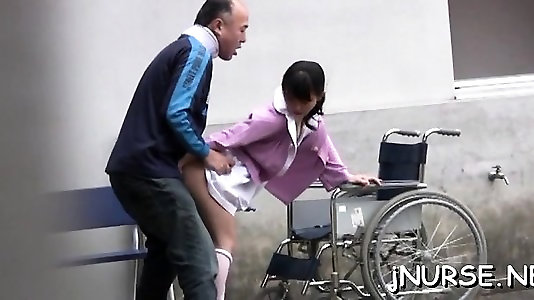 schöne japanische krankenschwester spielt mit fucktoys auf einem yam-größe fuck-stick