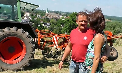 Bent over the tractor mature village bi-atch gets pummeled from behind